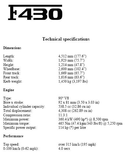 "The F430 hails the arrival of a new generation of Ferrari 8-cylinder engines. The new model takes Ferrari’s extraordinary achievements with aluminium construction technology, which started with the 360 Modena, to a whole new level and offers a series of extremely significant innovations directly derived from the Prancing Horse’s Formula 1 single-seaters.