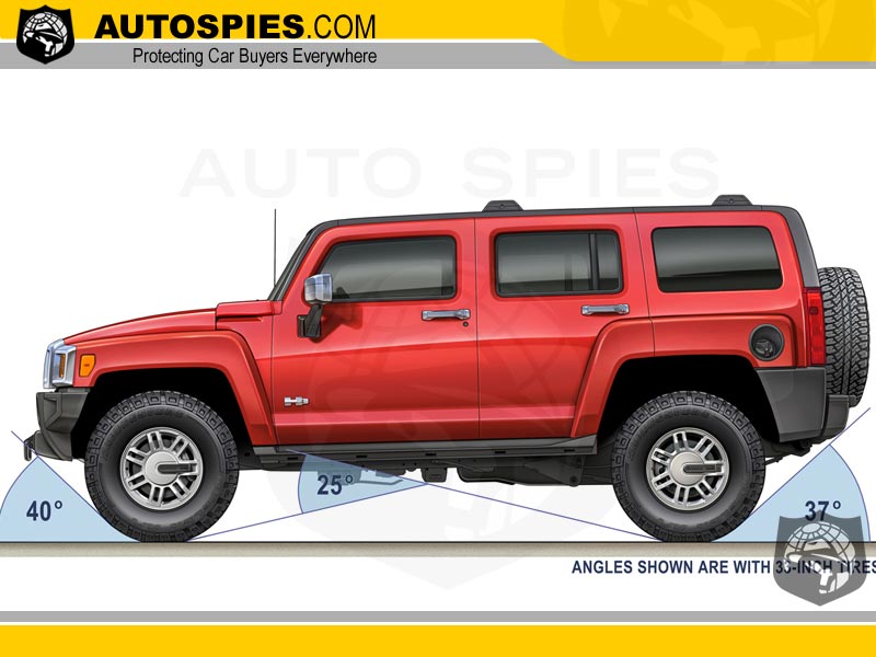 H3's more maneuverable size provides advantages, such as a 37-ft. turning circle and 9.1-inch ground clearance, which contribute to maximum breakover angle of 25 degrees (with 33-inch tires). Serious off-road performance is also aided by the maximum approach angle of 40 degrees and maximum departure angle of 37 degrees. These approach and departure angles permit the H3 to drive right into a hole and back out again, without getting hung up in front or rear.