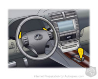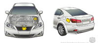 The new IS body construction plays a central role here as well, with a rigid passenger cell and careful design of sub-structures to absorb or dissipate collision energy. In addition to an advanced driver-side front airbag, the all-new IS has a new twin-chamber front passenger airbag, a world-first development designed to reduced secondary injuries related to airbag deployment. The IS also comes with driver and front passenger knee airbags, front and rear side curtain airbags and front seat side-mounted airbags to greatly enhance the passive safety of the new IS. First introduced on the LS 430, Lexus’ pre-Collision System (PCS) is now also available on the new IS. The PCS uses a millimeter-wave radar sensor to help detect obstacles in front of the car and a pre-collision system computer with vehicle speed, steering angle and yaw-rate inputs that help to determine in advance whether a collision is unavoidable. It then preemptively retracts front seat belts and pre-initializes Brake Assist so that increased braking is applied the instant the brake pedal is depressed.