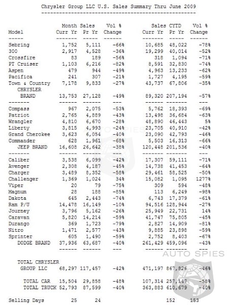 Chrysler Group LLC reported total U.S. sales for June 2009 of 68,297 units, a decrease of 42 percent compared with June 2008. The company finished the month with 195,272 units in inventory, representing a 71 day supply. Inventory is down 56 percent versus June 2008 when it totaled 440,075 units. Overall industry figures for June 2009 are projected to come in at an estimated 9.7 million SAAR.