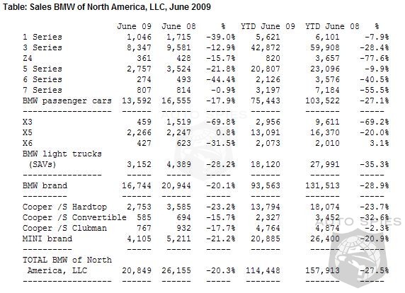 The BMW Group in the U.S. (BMW and MINI combined) reported June sales of 20,849 vehicles, a decrease of 20.3 percent from the 26,155 vehicles sold in the same month of 2008. The BMW Group also reported a year-to-date sales volume of 114,448 vehicles, down 27.5 percent, compared to 157,913 vehicles sold in the first half of 2008. BMW Brand Sales