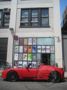 The facility itself is nothing wild, just a simple space with a couple of floor models, places to sit, have coffee, and pick options for your soon-to-be ride. When asked if they plan to make good on the statement at the Model S reveal that the dealership would facilitate a functioning art gallery, a representative stated that they will indeed do so, but slowly progress into it. Oh, and expect the works to have an automotive slant. The rep I spoke to also conveyed a desire to have projectors broadcasting images from other Tesla facilities, so say the California location has an event, they can share the festivities across the globe. Also significant is that this location broadens Tesla’s service network on the east coast, having a place to bring your Roaster in to for any issues, and making more service techs available for house calls.