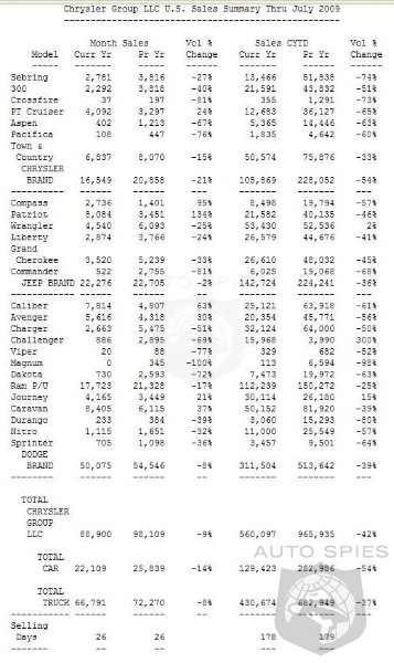 Chrysler Group LLC reported total U.S. sales for July 2009 of 88,900 units, an increase of 30 percent versus June 2009. Compared with the same time period in 2008, sales decreased 9 percent. Retail sales for July 2009 were 76,693 units. On July 27, the Company restarted production at nine of its 11 manufacturing facilities. Overall industry figures for July 2009 are projected to come in at an estimated 11.2 million SAAR.