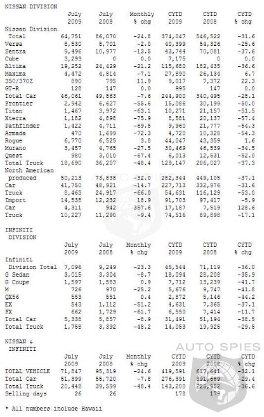 Nissan North America, Inc. (NNA) today reported sales for July of 71,847 units versus 95,319 units a year ago, a decrease of 24.6 percent. Sales of Nissan Division vehicles decreased 24.8 percent, while sales of Infiniti vehicles decreased by 23.3 percent. NNA INFORMATION