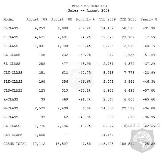 Mercedes-Benz USA (MBUSA) today reported August sales of 17,112 vehicles. Although August volume was slightly off by 7.5 percent versus August 2008, August sales were MBUSA's strongest so far this year and marked the fourth month of increasing sales momentum. The volume leaders for the month were the E-, C-, and M-Class with sales of 4,671, 4,253, and 2,577 respectively. The all-new 9(th) generation 2010 E-Class continues to exhibit strong sales performance, topping August 2008 by 74.2%.