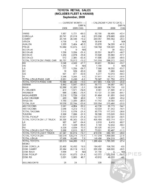 Toyota Motor Sales (TMS), U.S.A., Inc., today reported September sales of 126,015 vehicles, a decrease of 16.1 percent from last September, on a daily selling rate basis. TMS posted sales of 525,975 units in the third quarter, a 28 percent increase over the second quarter.