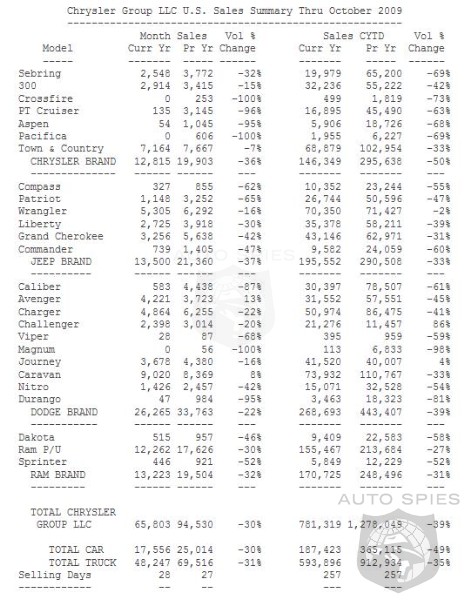 Chrysler Group reported total U.S. sales for October of 65,803 units, an increase of 6 percent compared with September and a decrease of 30 percent compared with the same time period in 2008. The company finished the month with 159,428 units in inventory, representing a 68-day supply. Inventory is down 60 percent versus October 2008 when it totaled 395,996 units. Overall industry figures for October are projected to come in at an estimated 10.4 million SAAR.