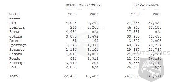 On the heels of its best quarter ever in company history, Kia Motors America (KMA) today announced October sales of 22,490 units, a 45.3-percent increase over the same month last year. Year to date sales totaled 261,060, a 7.2-percent increase over the same period last year. October sales were led by the all-new Kia Forte compact and Rio subcompact, selling 4,984 and 4,005 units respectively. The Kia Borrego SUV also sold well, posting its best month ever with 3,919 units. Kia Motors is in the midst of a dramatic, design-led transformation, which has been delivering dynamically styled vehicles in several important segments at exactly the right time contributing to the brand's continued gains in U.S. market share. The upcoming launch of the all-new 2011 Sorento CUV, the official vehicle of the NBA and the first vehicle to be built at the company's first U.S.-based manufacturing facilities in West Point, Georgia, will further enhance the lineup.