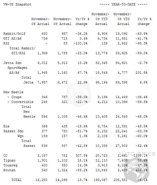 Volkswagen of America, Inc. today reported November 2009 sales of 16,250 total units, representing a 13.7 percent increase over November 2008. November marks Volkswagen's fifth consecutive sales month above last year. Volkswagen's stunning four door coupe, the CC, once again performed extremely well, and posted its best sales month ever with 3,187 units. The CC is an excellent example of what the Volkswagen Brand is all about -- affordable, fun-to-drive, and stylish German engineering.