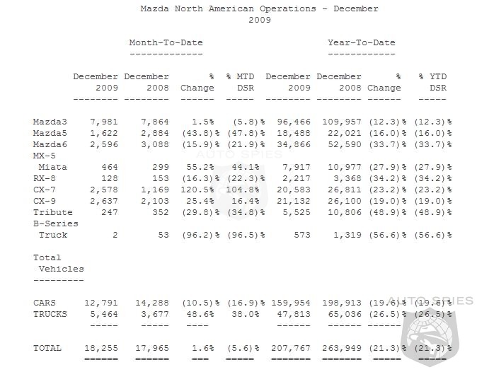 Mazda North American Operations (MNAO) today reported December 2009 sales of 18,255, up 1.6 percent versus December 2008, and the strongest single month of the last four. Full-year 2009 sales were 207,767, down 21.3 percent. There were 28 selling days in December 2009 compared to 26 in 2008, and 310 selling days in both 2008 and 2009. "Going in, we knew 2009 was going to be an extremely difficult year, and it lived up to its early billing all the way to the end," said Jim O'Sullivan, president and CEO, MNAO. "We reduced our fleet sales all year long to focus on long-term brand strength, residual values and profitability. With December coming in higher than last year, optimism is strong for a brighter 2010."