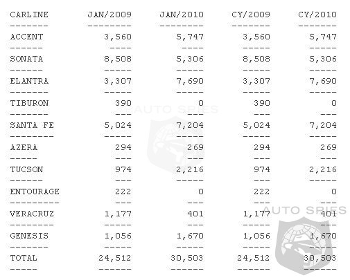 Hyundai Motor America today announced January sales of 30,503 units, up 24 percent versus January 2009. This marks the thirteenth consecutive month of year-over-year retail market share gains for Hyundai and our best retail share performance since the government's "Cash-for-Clunkers" program in August 2009. "While we were surprised and disappointed in the overall weakness of the industry in January, we are encouraged by our strong performance at both ends of the market spectrum. Our fuel-efficient Accent and Elantra entries were up 61 and 133 percent respectively, while our flagship Genesis recorded its best-ever retail segment share," said Dave Zuchowski, Hyundai Motor America's vice president of national sales.