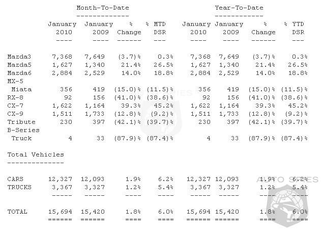Mazda North American Operations (MNAO) today reported January 2010 sales of 15,694, an increase of 1.8 percent versus January of 2009, and up 6.0 percent on a DSR (daily selling rate) basis (24 selling days in January 2010 compared to 25 selling days last January). The all-new 2010 MAZDA3, winner of ALG’s Residual Value Award for highest retained value after three years in service, continues as Mazda’s volume leader with sales of 7,368 units. Meanwhile, the MAZDA6 reported a 14.0 percent increase with sales of 2,884 units, MAZDA5 posted sales of 1,627 units accounting for a 21.4 percent increase and the CX-7 crossover SUV reported a 39.3 percent increase with sales of 1,622 units.