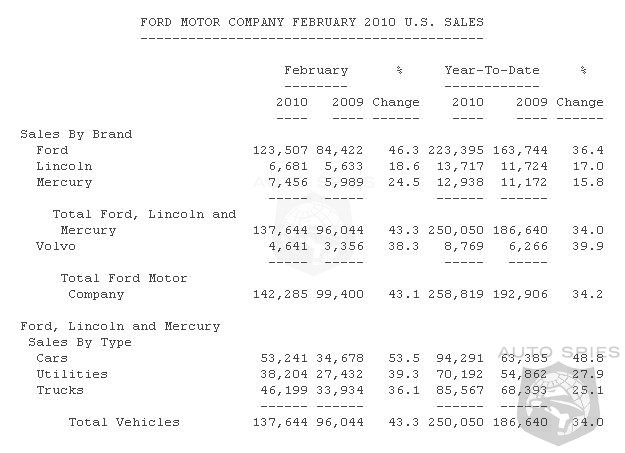 February sales were higher throughout Ford's line-up. Cars were up 54 percent versus a year ago, utilities were up 39 percent, and trucks were up 36 percent. Among brands, Ford sales were up 46 percent, Lincoln sales were up 19 percent, and Mercury sales were up 24 percent.