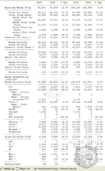 American Honda Motor Co., Inc., posted February sales of 80,671, an increase of 12.7 percent when compared to February 2009 results of 71,575, the company announced today. American Honda year-to-date sales of 148,150 represent an increase of 8.2 percent based on the daily selling rate*. Honda Division posted February sales of 71,732, an increase of 12.2 percent versus February 2009. The Accord lineup resulted in the most sales of any Honda nameplate for the month with 22,456, an increase of 40.6 percent. Additional models with year-over-year sales increases included the Civic, up 5.0 percent to 16,471; and the Odyssey, up 11.4 percent to 7,452.