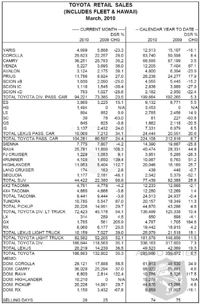 Toyota Division passenger cars recorded March sales of 94,221 units, an increase of 23.5 percent over the same period last year. Passenger car sales were led by Camry and Camry Hybrid which posted combined March sales of 36,251 units, up 35.2 percent over the year-ago month. Corolla posted sales of 29,623 units for the month, up 28.0 percent over last March. The Prius mid-size gas-electric hybrid posted March sales of 11,786 units, up 27.0 percent over March 2009. Venza posted a best-ever March, recording sales of 5,227 units, up 36.0 percent over the same period last year.