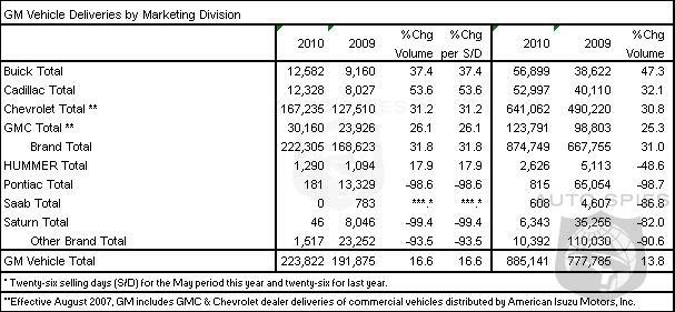 For the fifth straight month, Chevrolet, Buick, GMC and Cadillac together posted a double digit sales gain, with combined sales increasing 32 percent over last May. Year-to-date sales for GM's four brands have risen 31 percent to 874,749 units - an increase of 206,994 units compared to last year, which is almost twice the volume lost from brands the company has discontinued.