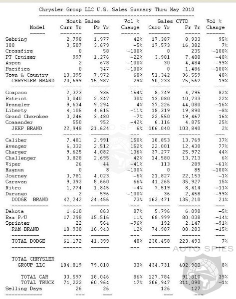 Chrysler Group LLC reported total U.S. sales for May of 104,819 units, an increase of 33 percent versus May 2009 (79,010 units). Sales increased 10 percent compared with April 2010 (95,703 units). Chrysler Group finished the month with a 49-day supply of inventory (196,210 units), a 25 percent decline versus May 2009 (260,407 units). Overall, U.S. industry sales figures for May are projected at an estimated 11.9 SAAR, the best month to date for the industry in 2010.