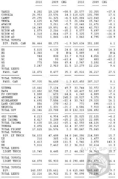 Toyota Division passenger cars recorded sales of 86,464 units, a decrease of 1.9 percent from last May. Passenger car sales were led by Camry and Camry Hybrid which posted combined May sales of 29,295 units. Corolla recorded sales of 26,953 units, up 14.3 percent over the year-ago month. The Prius mid-size gas-electric hybrid reported sales of 14,248 units for the month, up 41.2 percent over May 2009. The new Avalon sedan posted monthly sales of 3,029 units.