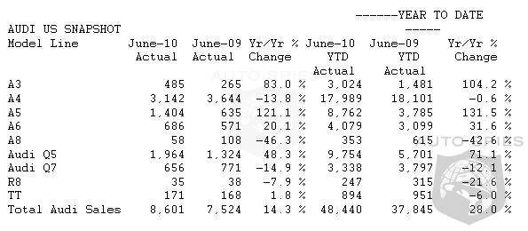 The 48,440 vehicles Audi sold in the January-June 2010 period eclipsed the previous first-half record of 45,711 vehicle sales set in the first six months of 2007. For June 2010, Audi reported sales of 8,601 cars and SUVs, a 14.3% increase above the 7,524 cars sold a year earlier.