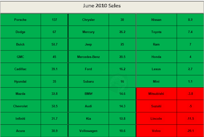 Overall the month of June proved to be kind for the auto industry with all but a handful of brands improving upon last year's sales. Porsche led everyone by more than doubling their sales on the strength of the new Panamera and Cayenne. Dodge and Buick brands also posted impressive improvements of over 50%. Cadillac led the luxury brands with a 39% increase. Many brands had sales improvements of over 10%, but Nissan, Toyota and Lexus bucked the trend and all had lesser improvements.