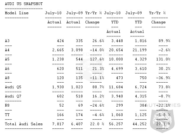 For the month, Audi recorded 7,817 sales compared to 6,407 in July 2009. The July 2010 results were buoyed by the continued extraordinary public response by year-over-year sales increases in the Audi Q5 crossover, Audi A5 coupe and cabriolet models and the Audi A6 luxury sedan. In July 2010, Audi sold 1,930 Q5 vehicles, nearly 89% more than the 1,023 vehicles sold in July 2009. Demand for the A6 continued its positive arc with a 21.3% gain in July 2010 sales compared to July 2009.