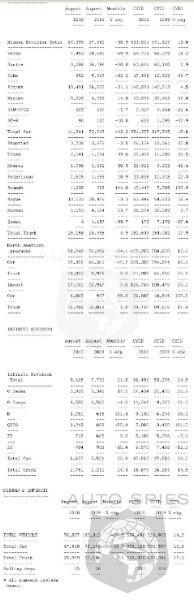 NOTE: To ensure consistency in global sales reporting, Nissan North America calculates monthly variances on a straight-percentage basis, unadjusted for the number of selling days. August 2010 had 25 selling days, while August 2009 had 26.