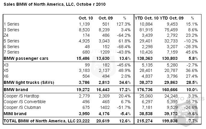 Sales of BMW brand vehicles in October increased 17.2 percent for a total of 19,272 vehicles from the 16,443 units sold in October of last year. Year-to-date, BMW sales were up 10 percent to 176,736 vehicles from the 160,666 units sold in the same period of 2009.