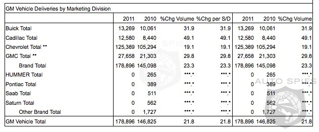 In January total sales for GM’s industry-leading lineup of fuel-efficient crossovers improved 31 percent versus January 2010, led by the Chevrolet Equinox (up 35 percent), GMC Terrain (up 48 percent) and Cadillac SRX (up 31 percent). Retail sales for the Buick Enclave, Chevrolet Traverse and GMC Acadia continued to improve in January, up 37 percent, 15 percent and 24 percent respectively.