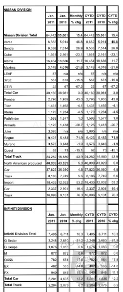 NOTE: To ensure consistency in global sales reporting, Nissan North America calculates monthly variances on a straight-percentage basis, unadjusted for the number of selling days. January 2011 had 24 selling days, as did January 2010.