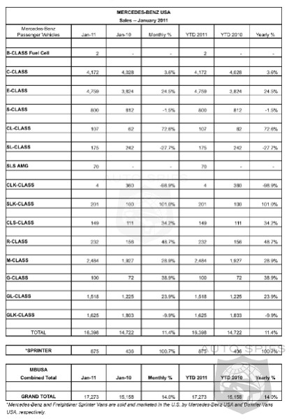 Mercedes-Benz USA (MBUSA) continued its strong momentum of the past year with a 14% increase for January 2011 (17,273 vs. 15,158). Strong demand in both the Mercedes-Benz passenger vehicles and SUVs fueled sales for the month, including diesel models which were up as a group by 136 percent over January 2010. The 9th generation E-Class was the volume leader with sales of 4,759, a 24.5 percent increase over last year, followed by the C-Class – the gateway to the Mercedes-Benz brand for younger and first-time Mercedes-Benz buyers – with sales of 4,172, a 3.6 percent increase over last year. Rounding out the top three volume lines is the popular M-Class SUV, which posted monthly sales of 2,484, a 28.9 percent over last January.