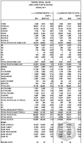 Toyota Motor Sales (TMS), U.S.A., Inc., today reported January sales results of 115,856 units. With 24 selling days in January 2010 and 2011, sales were up 17.3 percent over the year-ago month on a daily selling rate (DSR) and unadjusted raw volume basis.