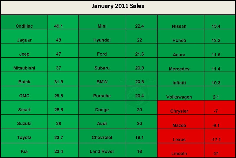 January was another good month for the auto industry as a whole with all but four brands turning in increased sales. The month also brought a few pleasant surprises with Mitsubishi, Smart, and Suzuki all improving on last year's sales. Cadillac led all brands with a 49.1% improvement over last January with Jaguar right behind at 48%. The Jeep brand (up 47%) is doing exceptionally well with its new Grand Cherokee and is quickly catching up to Dodge in overall sales. Also doing well for the month was the previously mentioned Mitsubishi that posted its best monthly sales since 2009. Not to be outdone Subaru and Audi posted record January sales. On the flip side the biggest surprise of the month was the large drop suffered by Lexus (17.1%) which forced Lexus to give up its luxury crown to Mercedes.