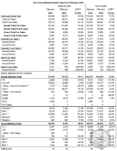American Honda Motor Co., Inc., posted February sales of 98,059, an increase of 21.6 percent compared to February 2010, the company announced today. February marks the fifth straight month of double-digit sales increases for American Honda. Year-to-date sales of 174,328 represent an increase of 17.7 percent. Honda Division posted February sales of 87,263, an increase of 21.7 percent compared to February 2010, with sales of light truck models increasing 31.8 percent to 39,923. Honda CR-V sales of 19,096 led light truck models, increasing by 61.4 percent and breaking the previous February 2008 sales record of 15,694. Additional light truck models with increased sales included the all-new Odyssey, up 17.3 percent to 8,744; the Pilot, up 23.3 percent to 8,224; and the Element, up 35.0 percent to 1,241. Car models with year-over-year sales increases included the Civic, up 16.1 percent to 19,121; and the Fit, up 43.6 percent to 4,200. Accord was the best-selling Honda vehicle for the month with sales of 22,916, up 2.0 percent.
