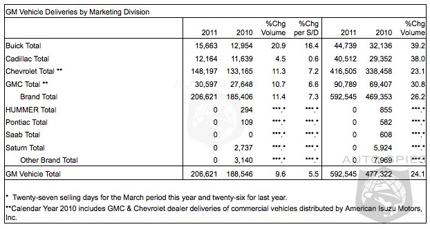 March capped a successful quarter for General Motors in the United States. Retail sales surged 38 percent for its four brands, driven by demand for Chevrolet's all-new Cruze compact sedan. In spite of a decline in incentives, dealers reported 206,621 total sales during March, an increase of 11 percent. This total included a 17 percent increase in retail sales, compared to March 2010.