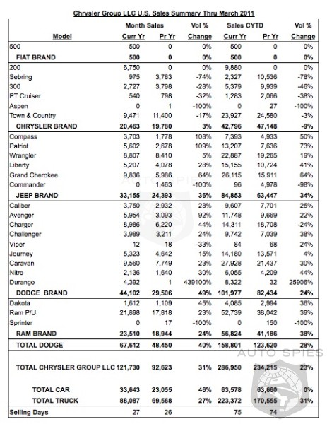 Chrysler Group LLC today reported U.S. sales of 121,730, a 31 percent increase compared with sales in March 2010 (92,623 units). This was the best March since 2008, and the highest sales for any month since May 2008.