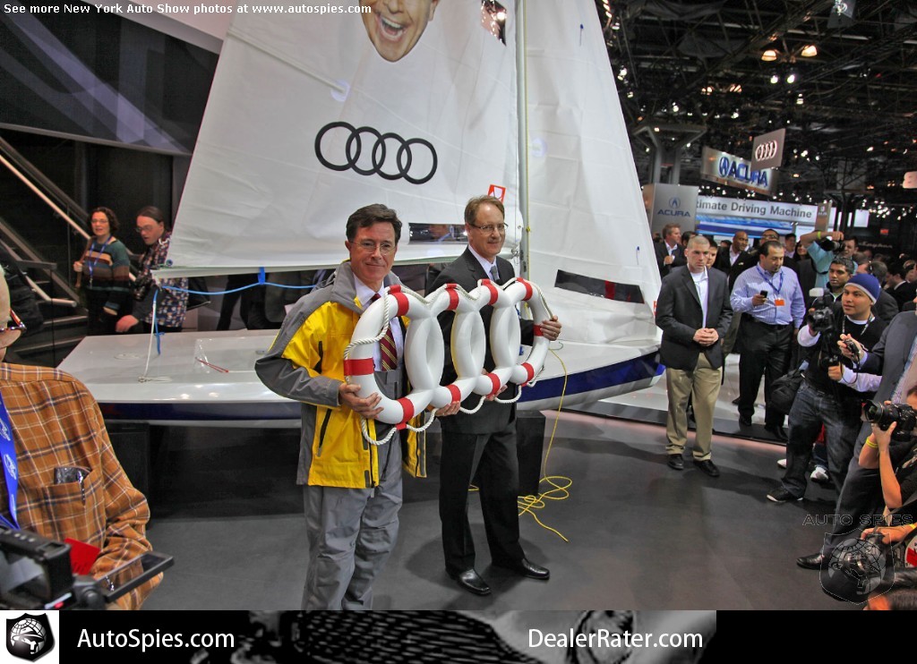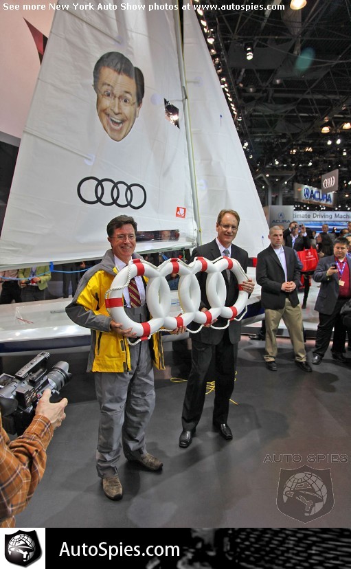 At an auto event it isn't standard fare to have a comedian come by in character. Even rarer is an announcement having to deal with sailing. Don't they have a boat show for a reason?Easily one of the buzzier events of the day was Stephen Colbert's appearance at the Audi press conference. Colbert challenged Richard Branson, known for Virgin, and Mark Allen, of Microsoft, to a sail boat race. This is where Audi comes in -- Audi is sponsoring Colbert's boat.Johan de Nysschen, Audi US President, then presented Colbert with a little gift from the four rings. Some may say its over engineered but that's how Audi rolls.**Watch it all unfold below, thanks to TFLcar.comStephen Colbert made a surprise appearance at the New York Auto Show and challenged Virgin's Richard Branson and Microsoft's founder Mark Allen to a sail boat race to Bermuda. Audi is sponsoring Colbert's sail boat and the Comedy Central comedian used the occasion to not only one-up the man-child millionaires, but to announce the partnership with Audi....[Source: TFLcar]2011 New York Auto Show Photo Gallery2011 New York Auto Show Photo GalleryNew York Auto Show Preview Photo Gallery2012 Audi A7 USA Model Photo GalleryLexus LF-Gh Concept Photo Gallery2012 Audi Q3 Photo GalleryAutoSpies.com Photo GalleriesIf you want to see your photos running on our homepage photo ticker, be sure to upload your photos on the go by sending them to Mobile@AutoSpies.com Share on FacebookRead Article
