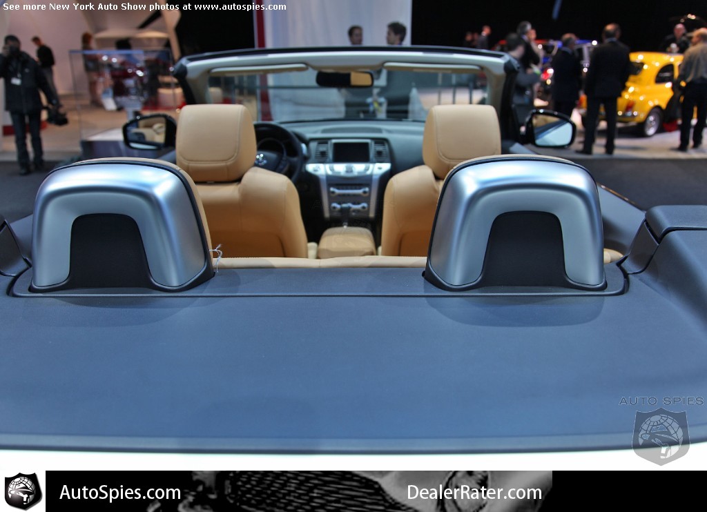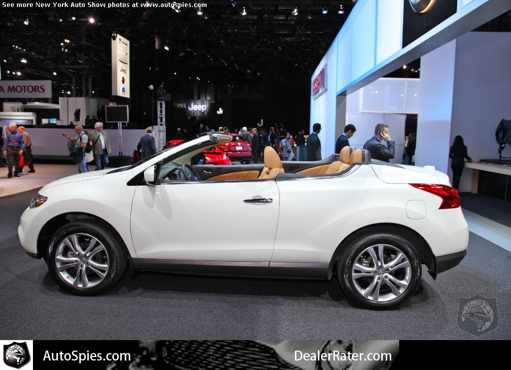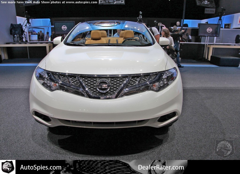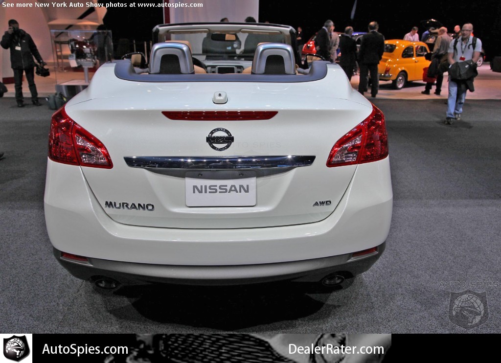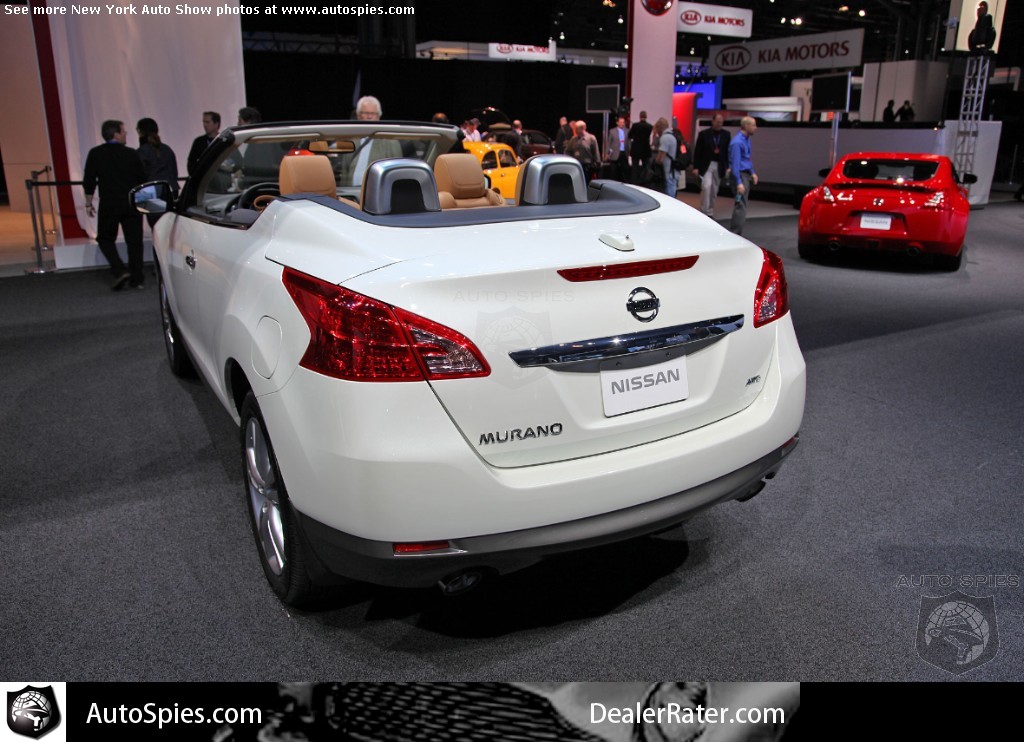 You know, 001 and I weren't exactly sure what to make of the Nissan Murano CrossCabriolet. We did know one thing though: we had to give props to Nissan for having the audacity to build such an extreme vehicle. When I imagined what a Murano convertible would look like, I imagined a picnic basket. Hell, that's what I likened it to while on-air during a live taping. Good thing I was wrong!The only problem was Nissan decided to show the car off in this horrendous aqua paint job that made little children's eyes fall out of their skulls. But there is good news. Now that the car has made its way to the Big City, Nissan gave it a more conservative, white paint that seems to make sense with this vehicle.A vehicle thought to be purely ridiculous makes more sense in a subdued and downplayed color. Hm, I wonder how it would look in black.Are the Agents onto something here? Does the color of the Murano CrossCabriolet change this vehicle's presence substantially?2011 New York Auto Show Photo Gallery2011 New York Auto Show Photo GalleryNew York Auto Show Preview Photo Gallery2012 Audi A7 USA Model Photo GalleryLexus LF-Gh Concept Photo Gallery2012 Audi Q3 Photo GalleryAutoSpies.com Photo GalleriesIf you want to see your photos running on our homepage photo ticker, be sure to upload your photos on the go by sending them to Mobile@AutoSpies.com Share on Facebook