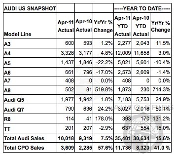 - Month-to-month Audi sales increase by 200 units over March 2011, and 7.5% YOY increase compared to April 2010.
