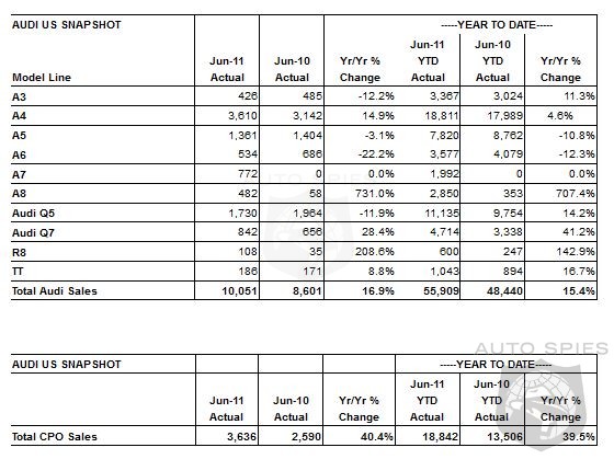 - Audi sales increase 16.9% YOY increase compared to June 2010, marking the fourth-best month in Audi of America history.