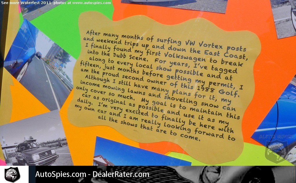 This past weekend I had the pleasure of enjoying my Sunday in the sun and surrounded by a crowd of German-loving auto enthusiasts. But that doesn't sound too out of the ordinary, does it? Well, then you haven't been to Waterfest.That's because it has to be one of the most unique auto events in our age. Sure, you can argue that it's like Bimmerfest but I think there is something about the atmosphere that is inherently different. It's more of a do-it-yourself environment that relies on good ol' fashion ingenuity and being grungy.You don't have to look far to see it either. From the purposefully rusted cars -- protected with a clear coat --, to the cars boasting dozens of stickers that really speak to the owner, these cars have personality. That's not something you can say of many VWs and Audis, which for years have been chastised for being staid autos.With that said, take a look at some of the unique rides at this year's Waterfest. We've got a FULL gallery and we'll be posting stories in the coming days. **Stay tuned to AutoSpies.com for the BEST automotive photos on the 'net!Waterfest 2011 Photo GalleryWaterfest 2011 Photo GallerySPIED! FIRST Look Next-Gen Ford Escape Photo Gallery2012 Audi A5 S5 Photo Gallery2011 ALMS Northeast Grand Prix Photo GalleryCars And Parades! Tribute To The Fourth Of July Photo GalleryEurocar Heaven! Best Of Rome Photo GalleryAutoSpies.com Photo GalleriesIf you want to see your photos running on our homepage photo ticker, be sure to upload your photos on the go by sending them to Mobile@AutoSpies.com Share on Facebook