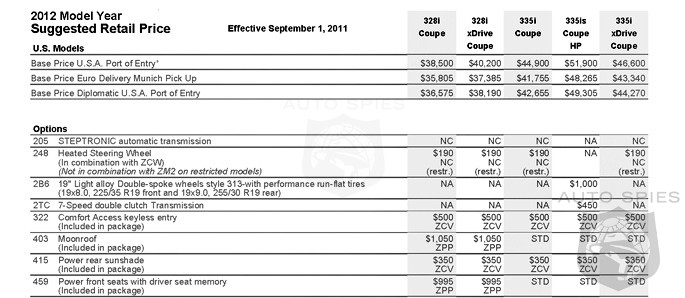 For all of your Bimmerphiles out there, today is going to be like Christmas. That's because thanks to our friends at Bimmerfest, the 2012 pricing information has been leaked onto the interweb.Essentially, that means if you're dreaming of your brand spankin' new BMW you can do so and have a damned good idea of exactly how much it will cost.That's right, go down the entire list and spec out your 2012 model because we've got 'em all, baby.**Click "Read Article" to see all of the detailed pricing information[Source: Bimmerfest]BMW i3 and i8 Concept Photo Gallery2012 Mercedes-Benz C63 AMG Coupe Black Series Photo GalleryFull 2011 Comicon Photo GalleryWaterfest 2011 Photo GallerySPIED! FIRST Look Next-Gen Ford Escape Photo Gallery2012 Audi A5 S5 Photo GalleryAutoSpies.com Photo GalleriesIf you want to see your photos running on our homepage photo ticker, be sure to upload your photos on the go by sending them to Mobile@AutoSpies.com Share on Facebook Read Article