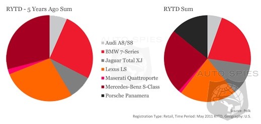 Compared to five years ago, the Maserati Quattroporte, Lexus LS, BMW 7-Series and Audi A8 are all seeing declines in market share. According to the stats, the Panamera is behind the 1) Mercedes-Benz S-Class 2) BMW 7-Series 3) Lexus LS. Considering it's so new, that's impressive. Clearly the vehicles suffering the most bleeding are the Lexus LS and Mercedes S-Class.