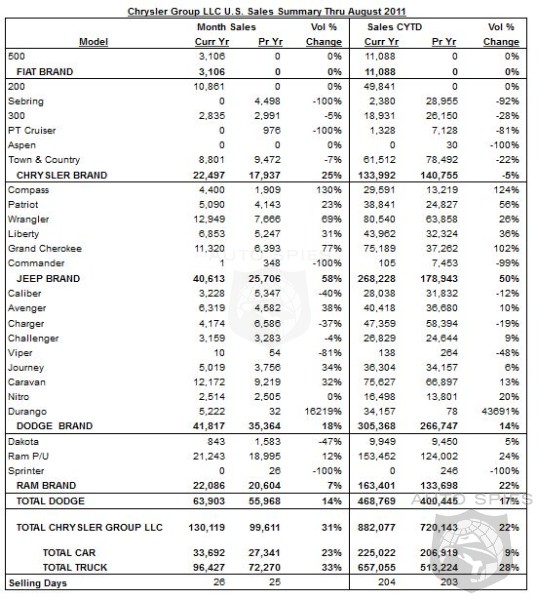 Chrysler Group LLC today reported U.S. sales of 130,119, a 31 percent increase compared with sales in August 2010 (99,611 units), and the best August sales since 2007.