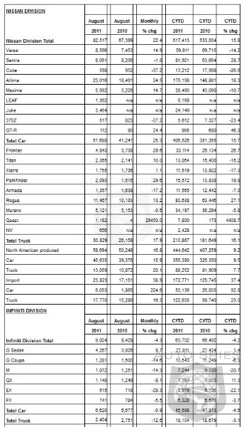 NOTE: To ensure consistency in global sales reporting, Nissan North America calculates monthly variances on a straight-percentage basis, unadjusted for the number of selling days. August 2011 had 26 selling days, while August 2010 had 25 selling days.