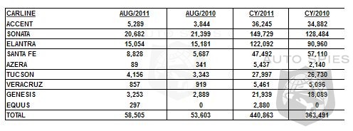 The all-new Accent, in its second full month on sale, saw sales soar 38 percent. In July, it was the best-selling sub-compact in the market. Santa Fe and Tucson saw sales increases of 55 and 24 percent, respectively, as availability issues eased. Genesis continued its growth trajectory in August with its 26th consecutive month of year-over-year sales increases, and a sales lift of 13 percent over last August. And Equus, the highest-ranking premium luxury car in the 2011 J.D. Power and Associates APEAL study, delivered another strong month and is pacing well ahead of its first full-year sales target.