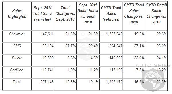 General Motors Co today reported total sales of 207,145 vehicles in September, a 20-percent increase compared with September 2010. Retail deliveries were up 19 percent compared with the same month a year ago and accounted for 74 percent of GM sales. Deliveries to fleet customers increased 22 percent.