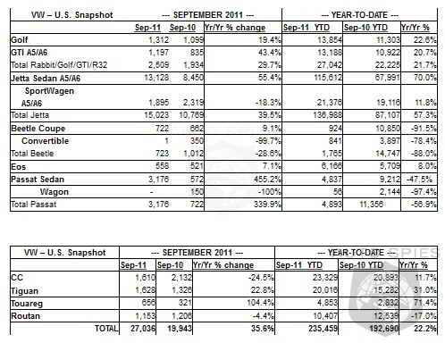 Volkswagen of America, Inc. today reported 27,036 units sold in September 2011, a 35.6 percent increase over prior year sales. Year-to-date sales are up 22.2 percent.