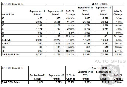 For the record-setting month of September 2011, Audi recorded YTD sales increases of over 25% with four of its models: the Audi A8, the Audi Q7, the Audi R8 and the Audi TT. In addition, the Audi southern regions experienced strong gains, with YTD sales jumping 20% to 20,966 vehicles sold. The Texas and Atlanta markets were especially strong in September.