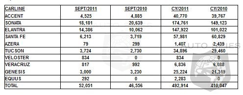 Hyundai Motor America today announced sales of 52,051 vehicles in September, a 12 percent total sales increase compared with the same period a year ago, and a 16 percent retail sales increase over last September. "Finishing September with such strong momentum is no small feat, especially considering the disappointing economic climate," said Dave Zuchowski, Hyundai Motor America's executive vice president of national sales. "Consumer demand remained strong, vehicle availability improved, and we've added yet another entry to our family of standard 40 MPG fuel economy vehicles with the all-new Veloster."