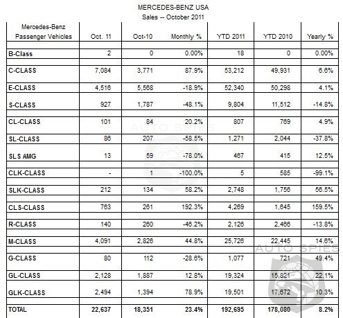 Mercedes-Benz USA today reported October sales of 24,449 vehicles, a 28.2% improvement over October 2010 (19,076) and the company's highest October volume on record. On a year-to-date basis, the 206,632 vehicles sold represent a 12% increase over the 184,431 vehicles sold during the same period last year. The highest volume performers for the month were the C-Class and E-Class model lines. The all-new 2012 sporty C-Class – gateway to the Mercedes-Benz brand for younger and first-time Mercedes-Benz buyers – led the pack with sales of 7,084, up 87.9% from October 2010. The 9th generation E-Class followed with sales of 4,516 and the all-new versatile M-Class, finished third in volume with monthly sales of 4,091. Additionally, sales of the 2012 CLS-Class posted a 192.3% increase for the month and sales of the new SLK roadster were up 58.2% over October 2010.
